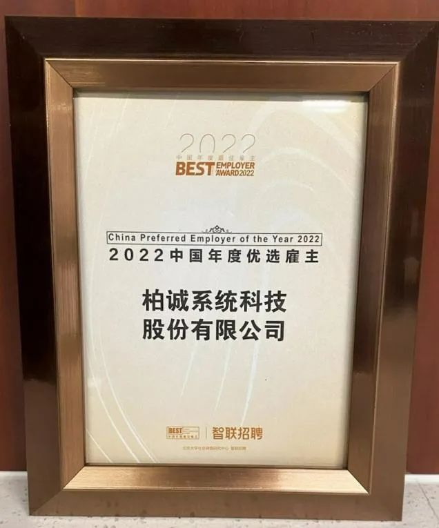 近日,柏誠系統(tǒng)科技股份有限公司榮獲智聯招聘“2022中國年度優(yōu)選雇主”稱號。