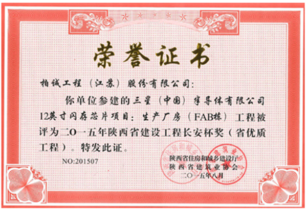 我公司參建的三星(中國)半導(dǎo)體有限公司12英寸閃存芯片項目:生產(chǎn)廠房(FAB棟)工程被評為二零一五年陜西省建設(shè)工程長安杯(省優(yōu)質(zhì)工程)